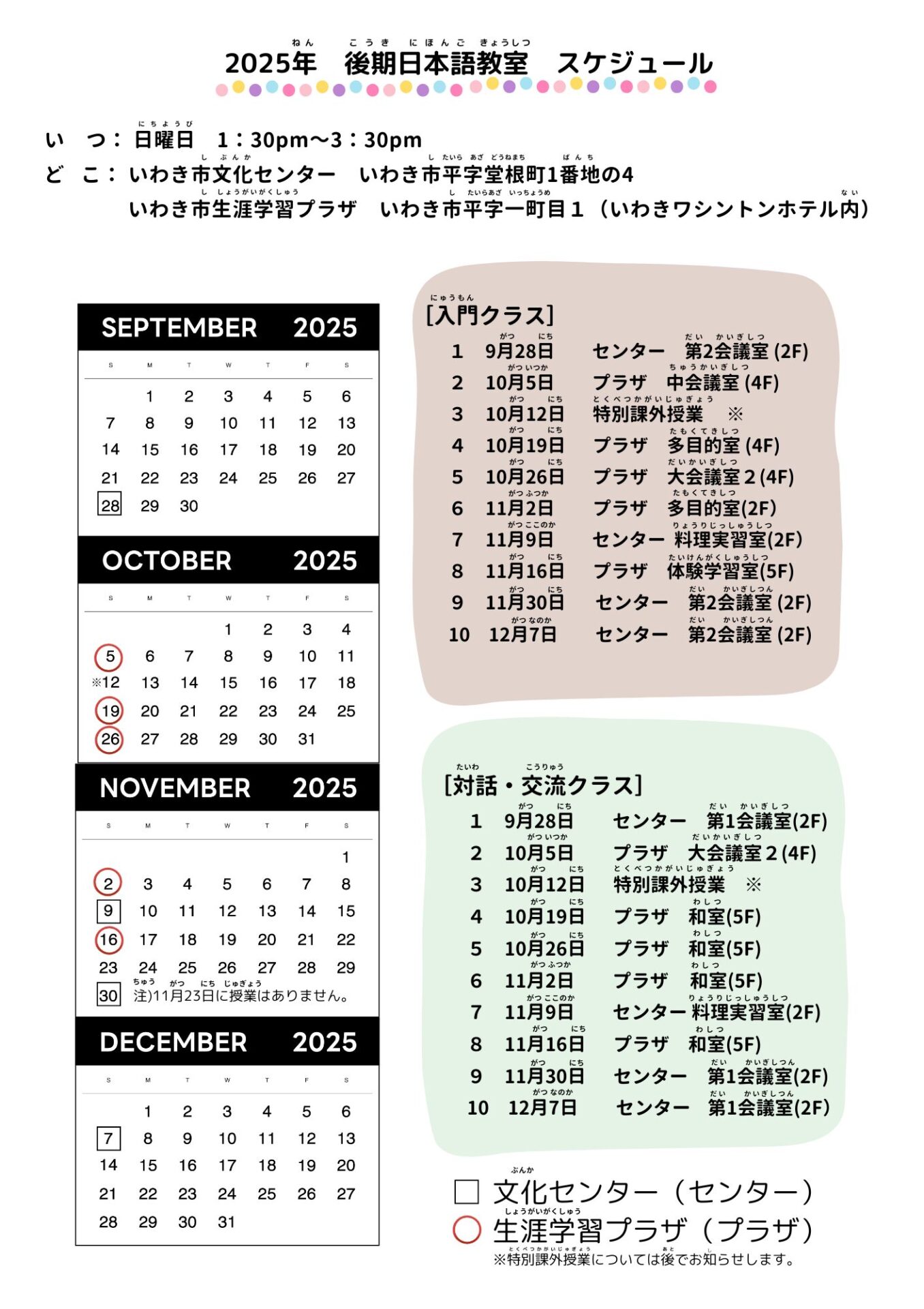 2024(令和6)年後期に行った日本語教室は、下田先生、白土先生に加えて、入門クラスには「日本語教室講師養成プログラム」の参加者である佐々木さん、渡辺さんも講師として加わりました。2つのクラスとも会話を中心として楽しい授業が行われました。課外授業ではJICA二本松と二本松菊人形展を見学しました。日本語はみんなで勉強するともっと楽しいですよ!