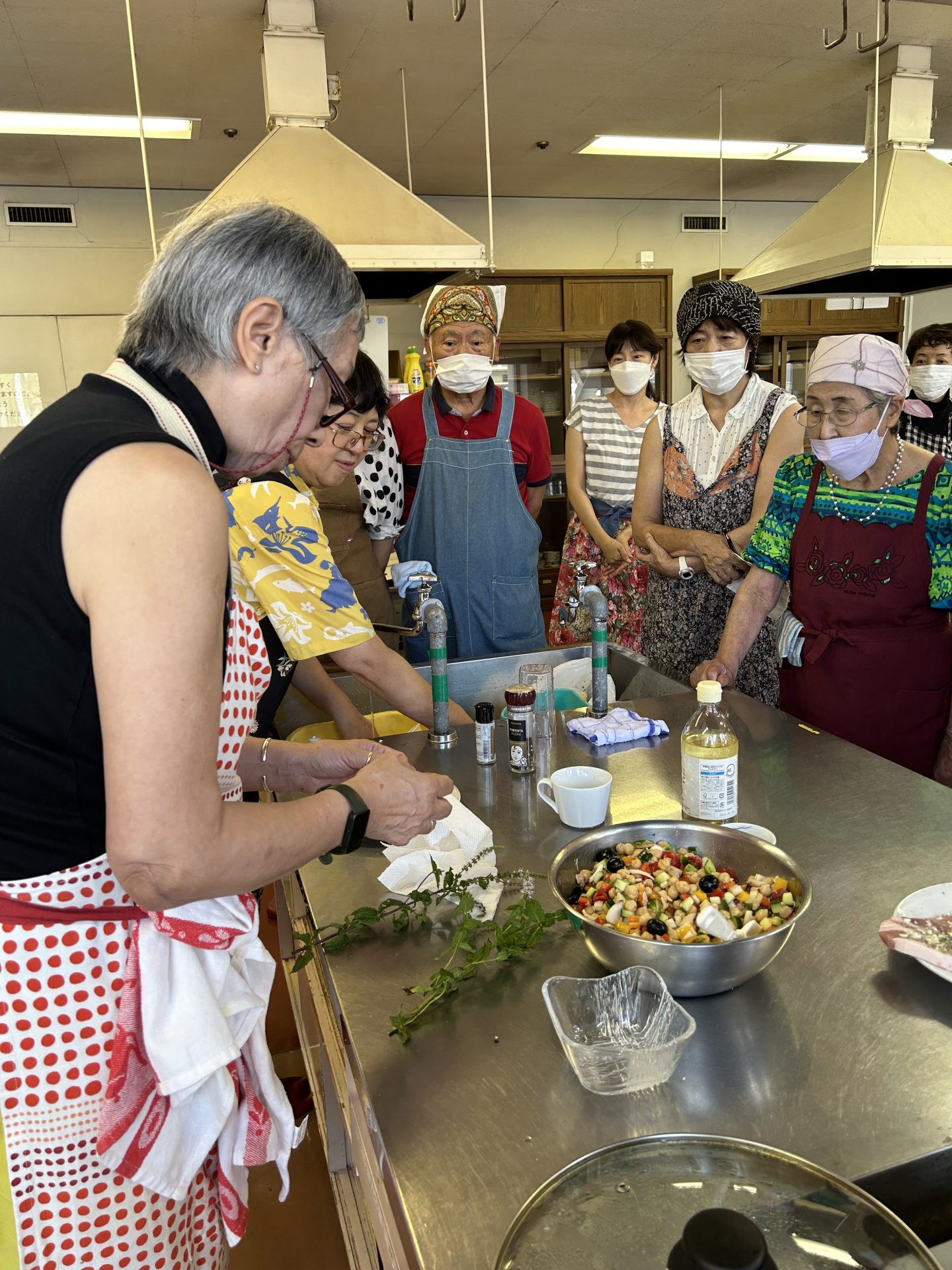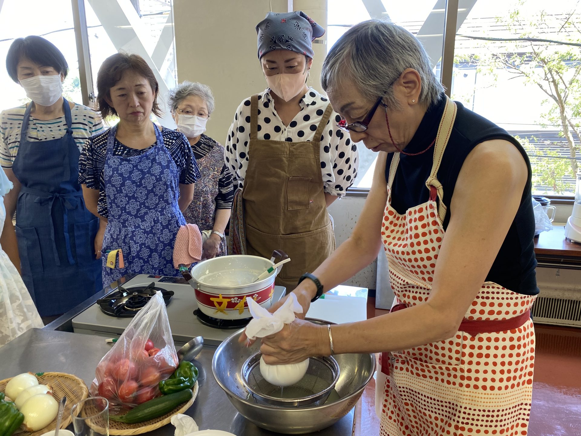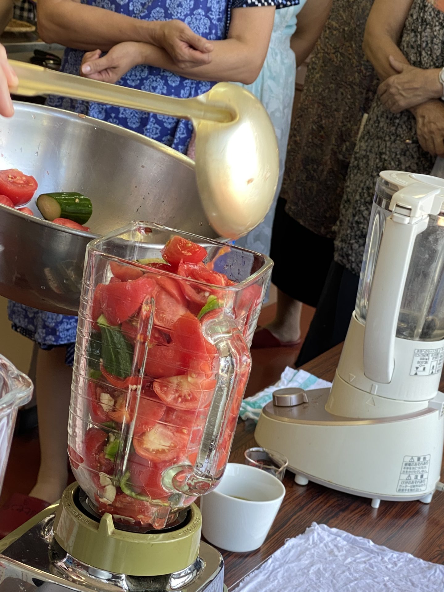 8月(がつ)1日(ついたち)(木(もく))、文化(ぶんか)センター(料理実習室(りょうりじっしゅうしつ))でスペイン料理教室(りょうりきょうしつ)を開催(かいさい)。草野弥生(くさのやよい)さん(内郷出身(うちごうしゅっしん)、グラナダ在住(ざいじゅう))から暑(あつ)い夏(なつ)にぴったりの5品(しな)を教(おし)えていただき、参加者(さんかしゃ)(14名(めい))はガスパチョ、ひよこ豆(まめ)のサラダ、ゆで卵(あまご)の詰(つ)め物(もの)、豚肉(ぶたにく)のアルプハラスタイルとじゃがいもの付(つ)け合(あ)わせ、フレッシュチーズのはちみつがけなど色鮮(いろあざ)やかな食欲(しょくよく)をそそる本場(ほんば)スペインの味(あじ)を堪能(たんのう)しました。