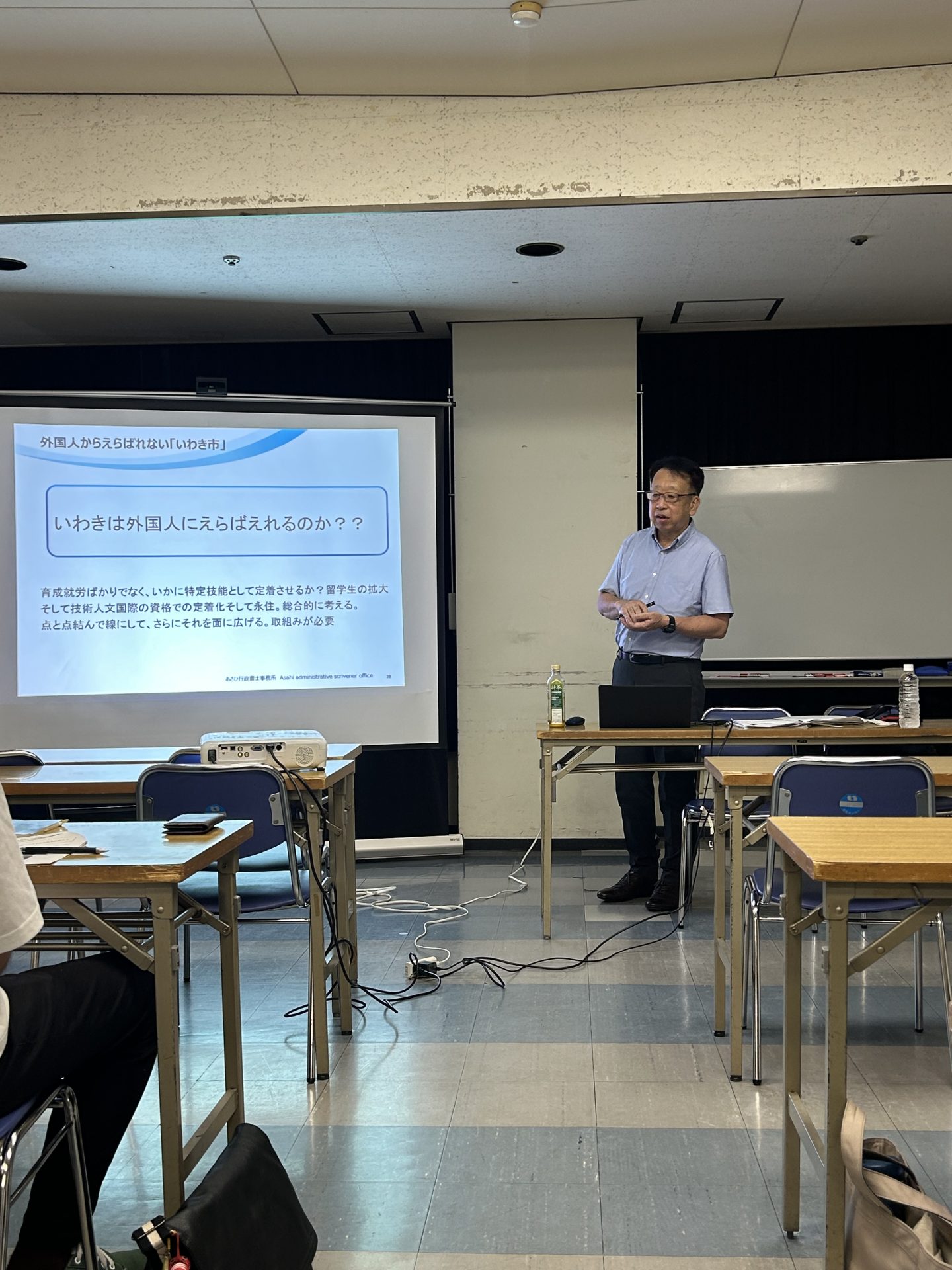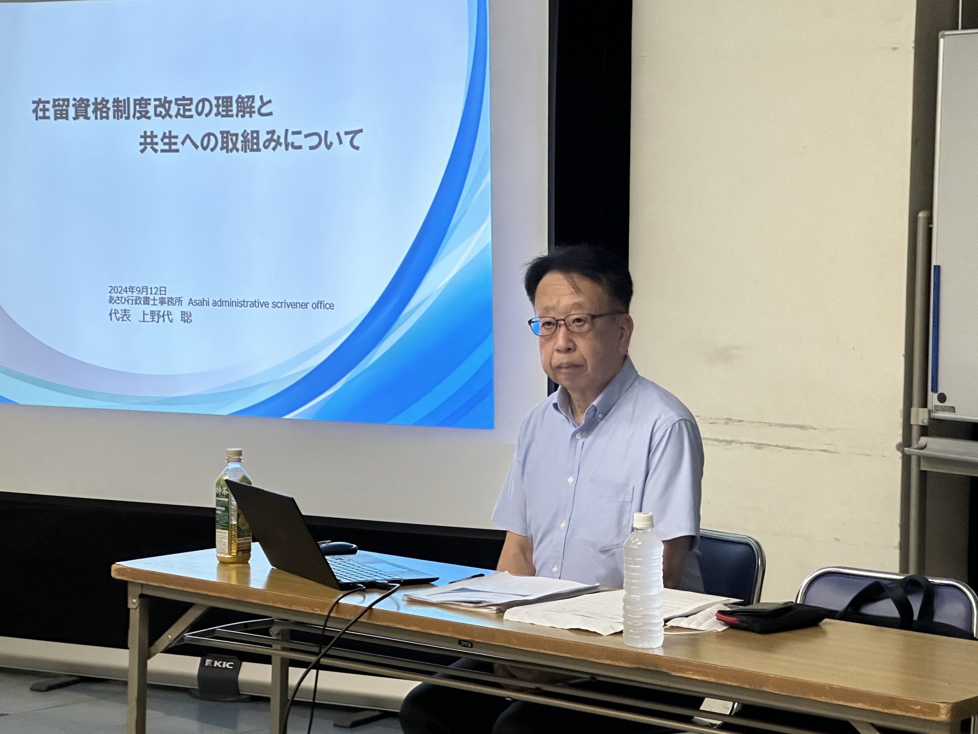 9月(がつ)12日(にち)(木(もく))、上野代 聡(うえのだい さとし)氏(し)(特定行政書士(とくていぎょうせいしょし)より、技能実習制度(ぎのうじっしゅうせいど)から育成就労制度(いくせいしゅうろうせいど)へ改正(かいてい)される在留資格制度(ざいりゅうしかくせいど)について事例(じれい)を交(まじ)えて説明(せつめい)していただきました。さらに、外国人(がいこくじん)から選(えら)ばれるいわき市(し)になるための多文化共生(たぶんかきょうせい)への取(と)り組(く)み強化(きょうか)の必要性(ひつようせい)について講師(こうし)からいわき市(し)への課題提起(かだいていき)がありました。