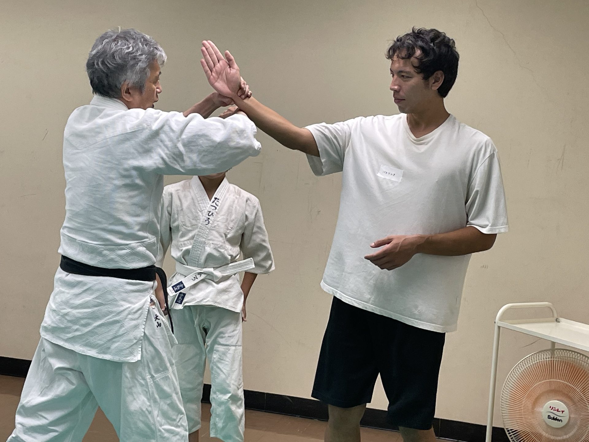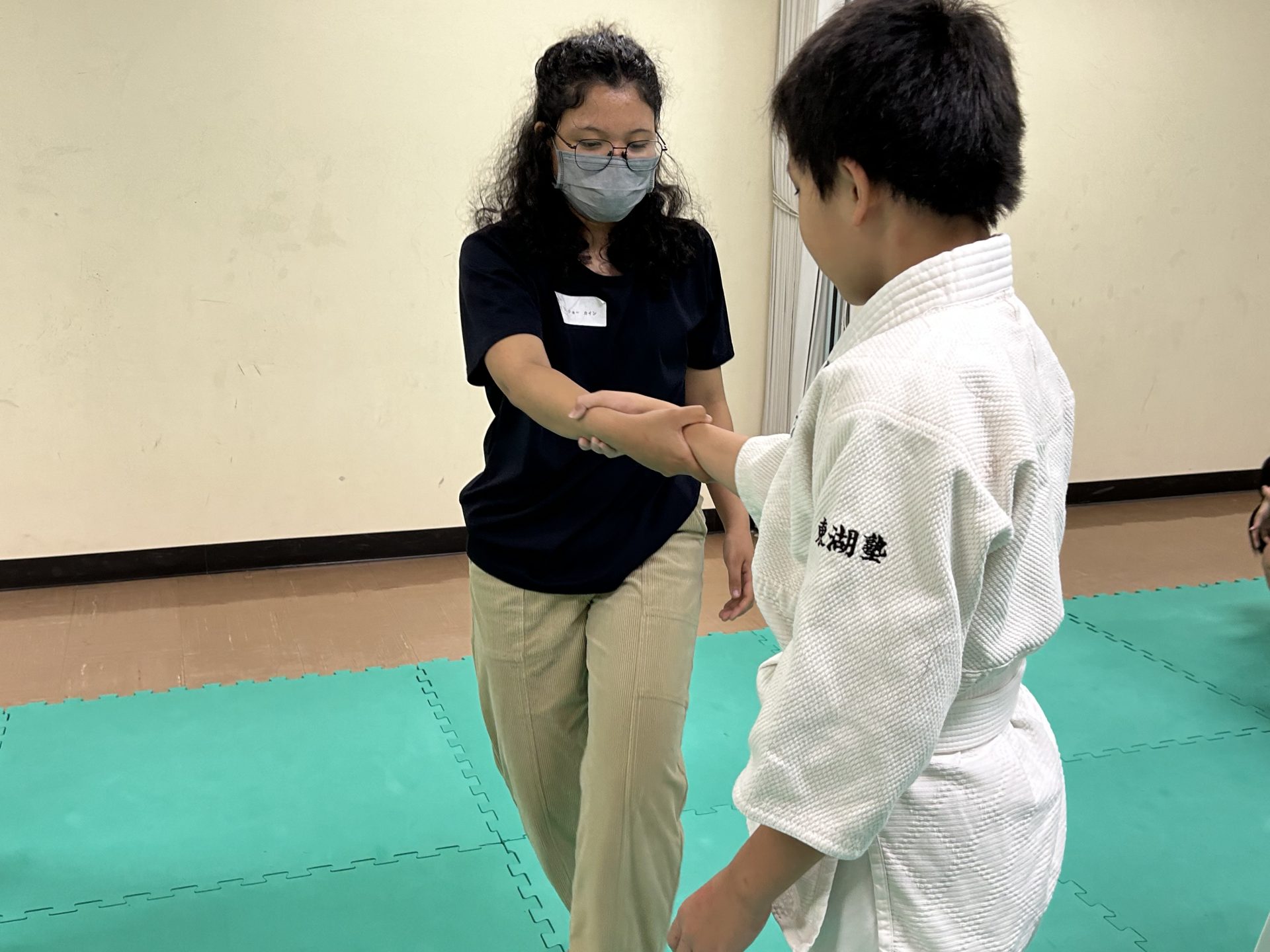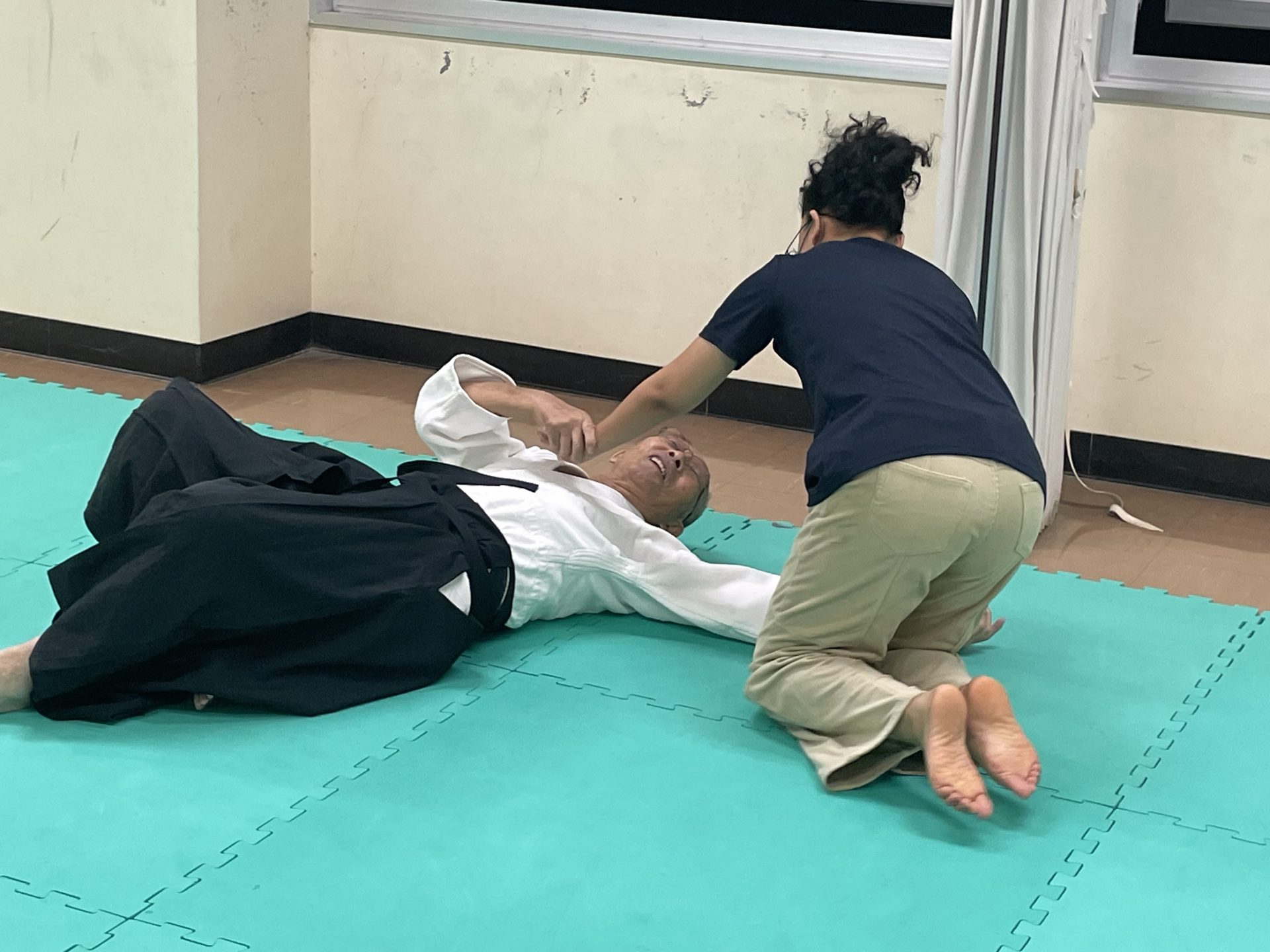 10月(がつ)3日(みっか)(木(もく))、平体育館(たいらたいいくかん)にて、合気道(あいきどう)の体験(たいけん)を行(おこな)い、7か国(こく)、8名(めい)が参加(さんか)しました。参加者(さんかしゃ)は講師(こうし)の忍山東(おしやま あずま)氏(し)(いわき東湖塾(とうこじゅく))の指示(しじ)のもと、東湖塾(とうこじゅく)の塾生(じゅくせい)の皆(みな)さんと一緒(いっしょ)に、入念(にゅうねん)な準備体操(じゅんびたいそう)後(ご)に合気道(あいきどう)の初歩(しょほ)の手(て)ほどきを受(う)けました。互(たが)いに自然(しぜん)で無理(むり)のない技(わざ)で向(むか)いあった相手(あいて)を伏(ふ)せさせたり、倒(たお)したりする、合気道(あいきどう)特有(とくゆう)の不思議(ふしぎ)な身体(からだ)の組(く)み方(かた)に、参加者(さんかしゃ)は興味津々(きょうみしんしん)でした。