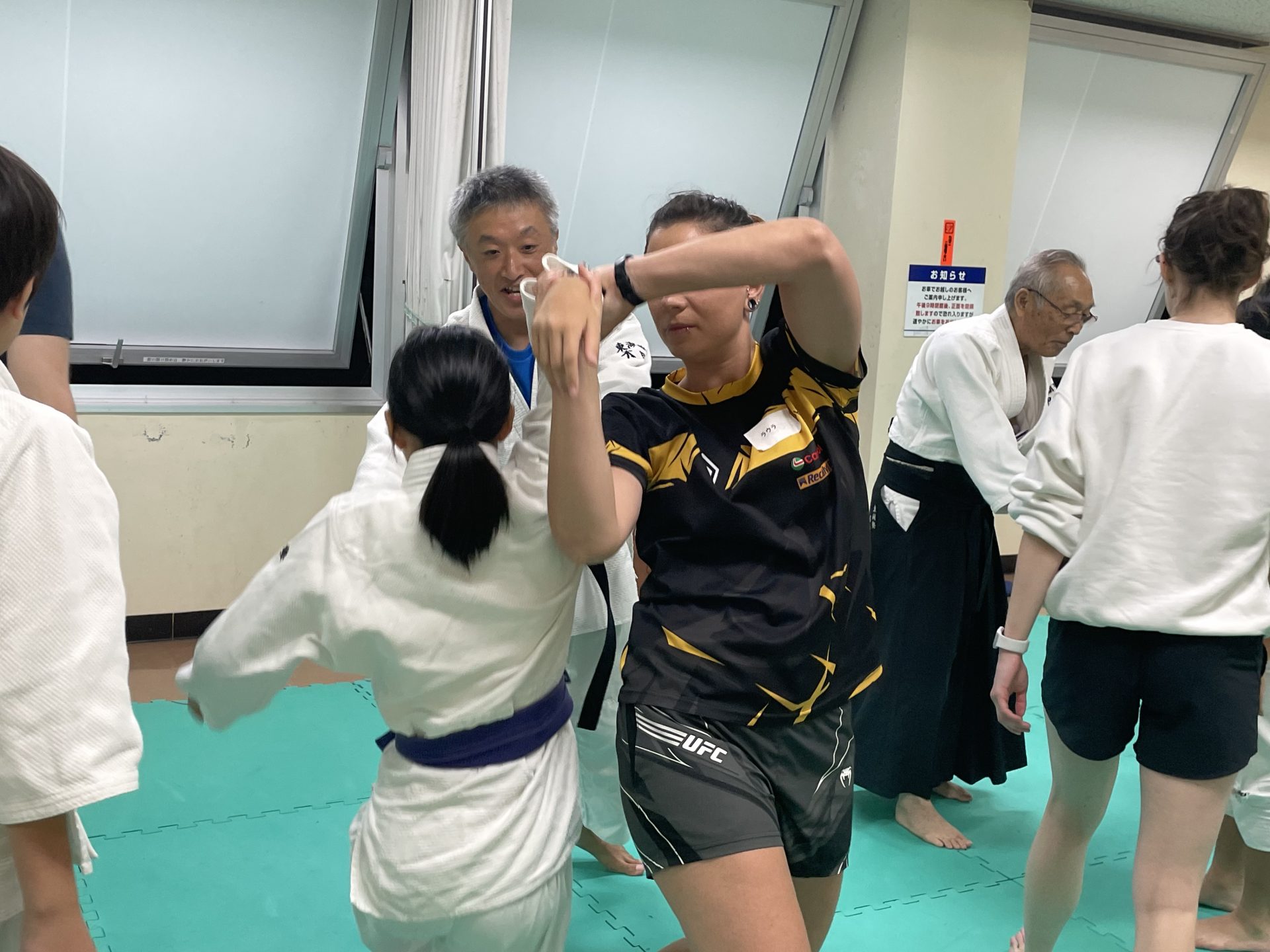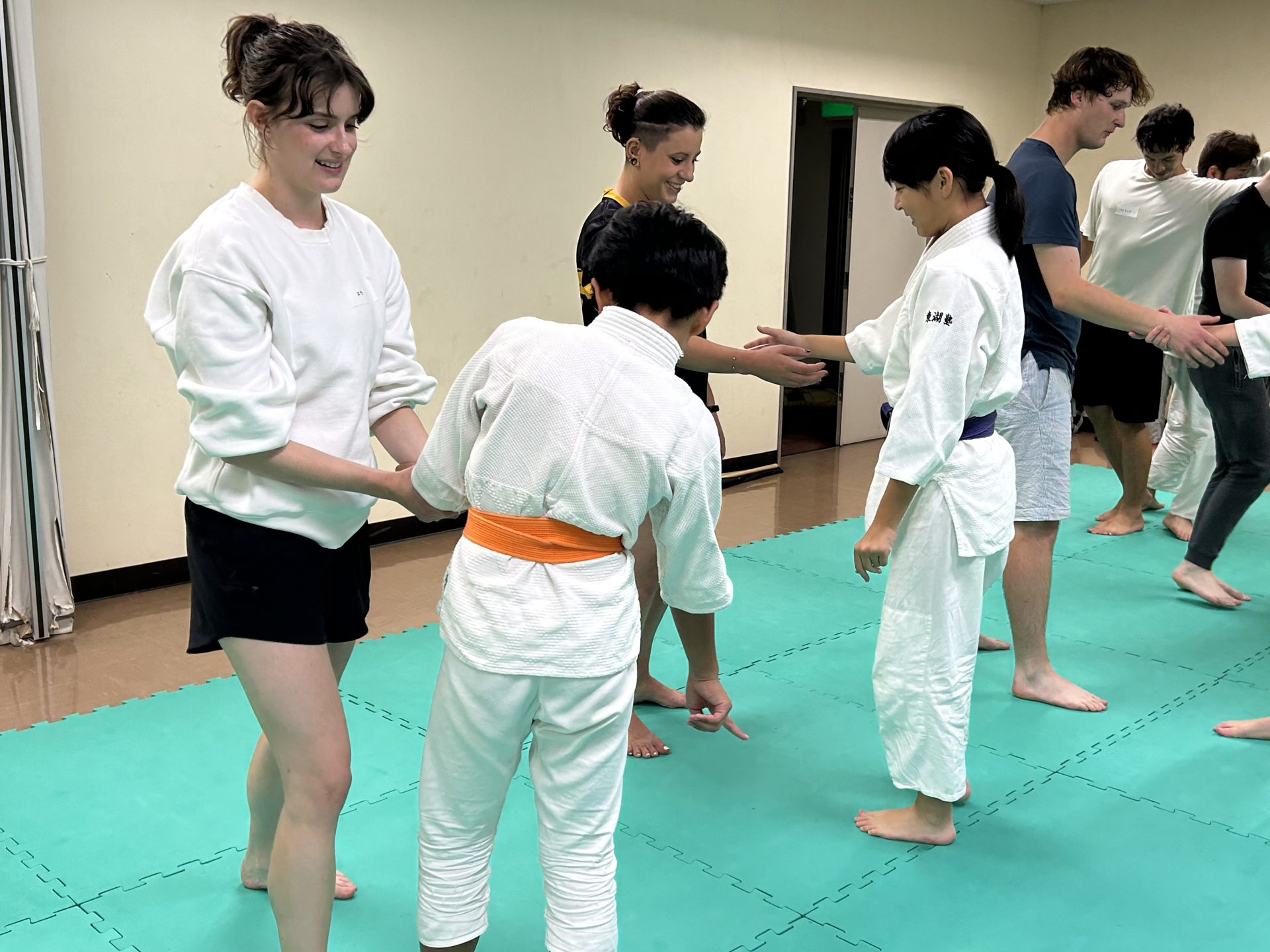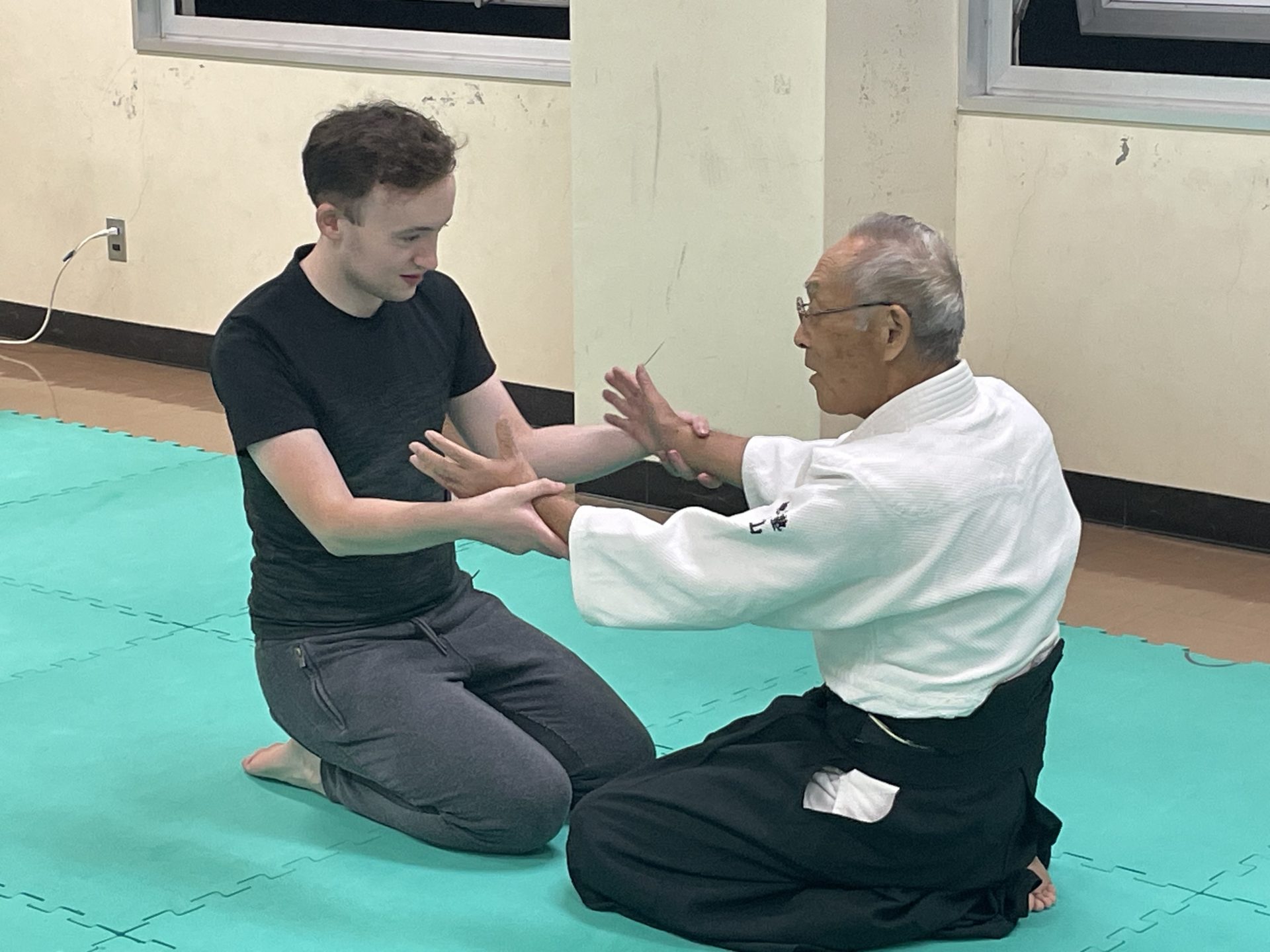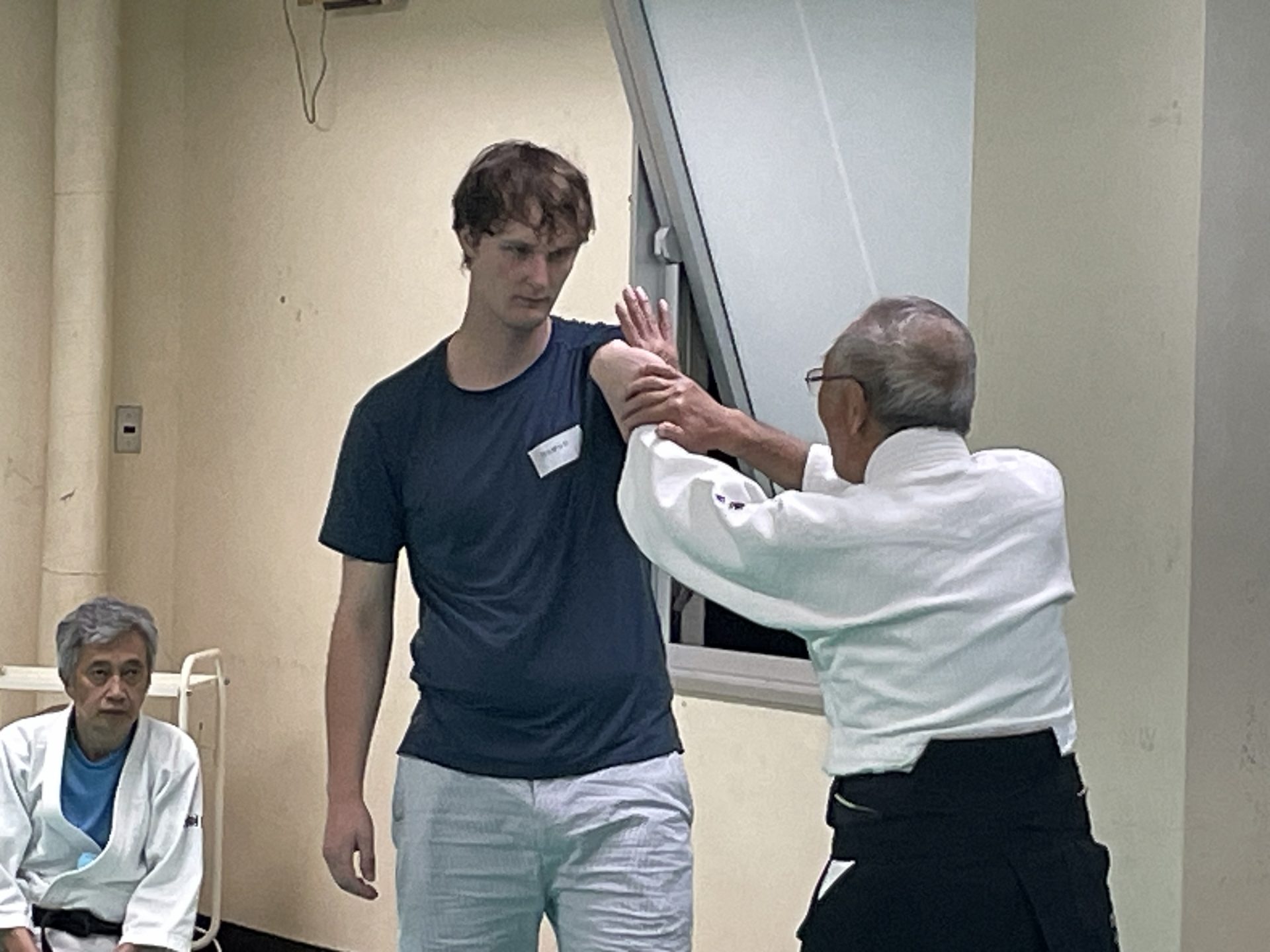 10月(がつ)3日(みっか)(木(もく))、平体育館(たいらたいいくかん)にて、合気道(あいきどう)の体験(たいけん)を行(おこな)い、7か国(こく)、8名(めい)が参加(さんか)しました。参加者(さんかしゃ)は講師(こうし)の忍山東(おしやま あずま)氏(し)(いわき東湖塾(とうこじゅく))の指示(しじ)のもと、東湖塾(とうこじゅく)の塾生(じゅくせい)の皆(みな)さんと一緒(いっしょ)に、入念(にゅうねん)な準備体操(じゅんびたいそう)後(ご)に合気道(あいきどう)の初歩(しょほ)の手(て)ほどきを受(う)けました。互(たが)いに自然(しぜん)で無理(むり)のない技(わざ)で向(むか)いあった相手(あいて)を伏(ふ)せさせたり、倒(たお)したりする、合気道(あいきどう)特有(とくゆう)の不思議(ふしぎ)な身体(からだ)の組(く)み方(かた)に、参加者(さんかしゃ)は興味津々(きょうみしんしん)でした。