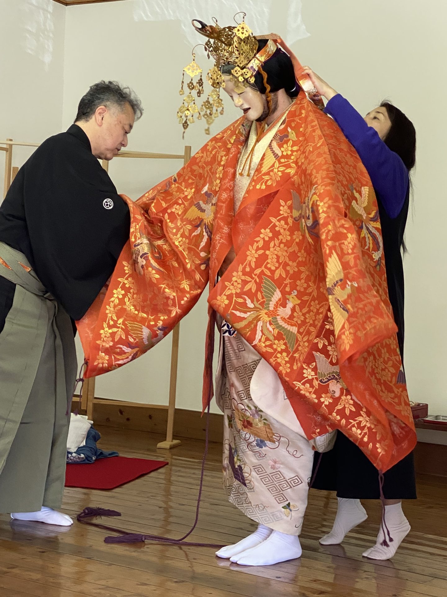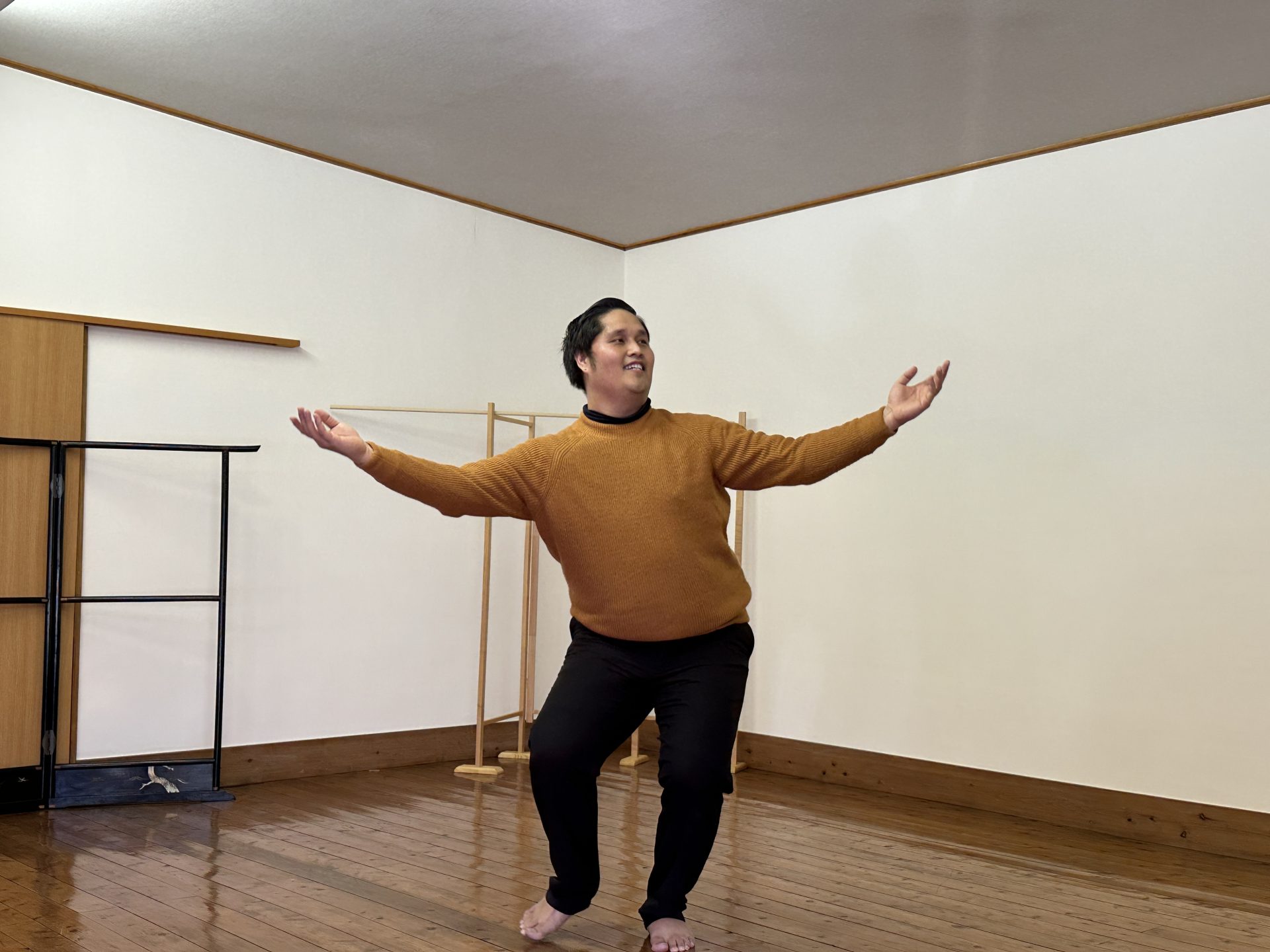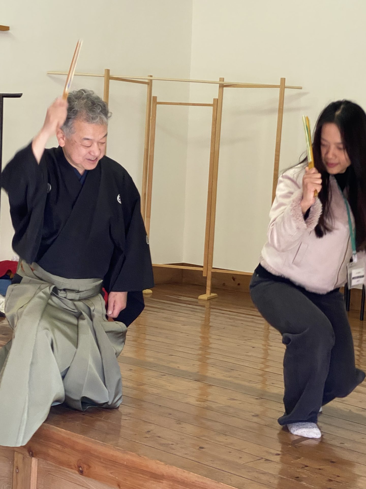 午前(ごぜん)の「能楽(のうがく)ワークショップ」は、東京在住(とうきょうざいじゅう)、重要無形文化財総合指定(じゅうようむけいぶんかざいそうごうしてい)(能楽(のうがく))保持者(ほじしゃ)、宝生流(ほうしょうりゅう)シテ方(かた)の能楽師(のうがくし)である佐野登先生(さののぼるせんせい)の指導(しどう)の元(もと)に行(おこな)われました。