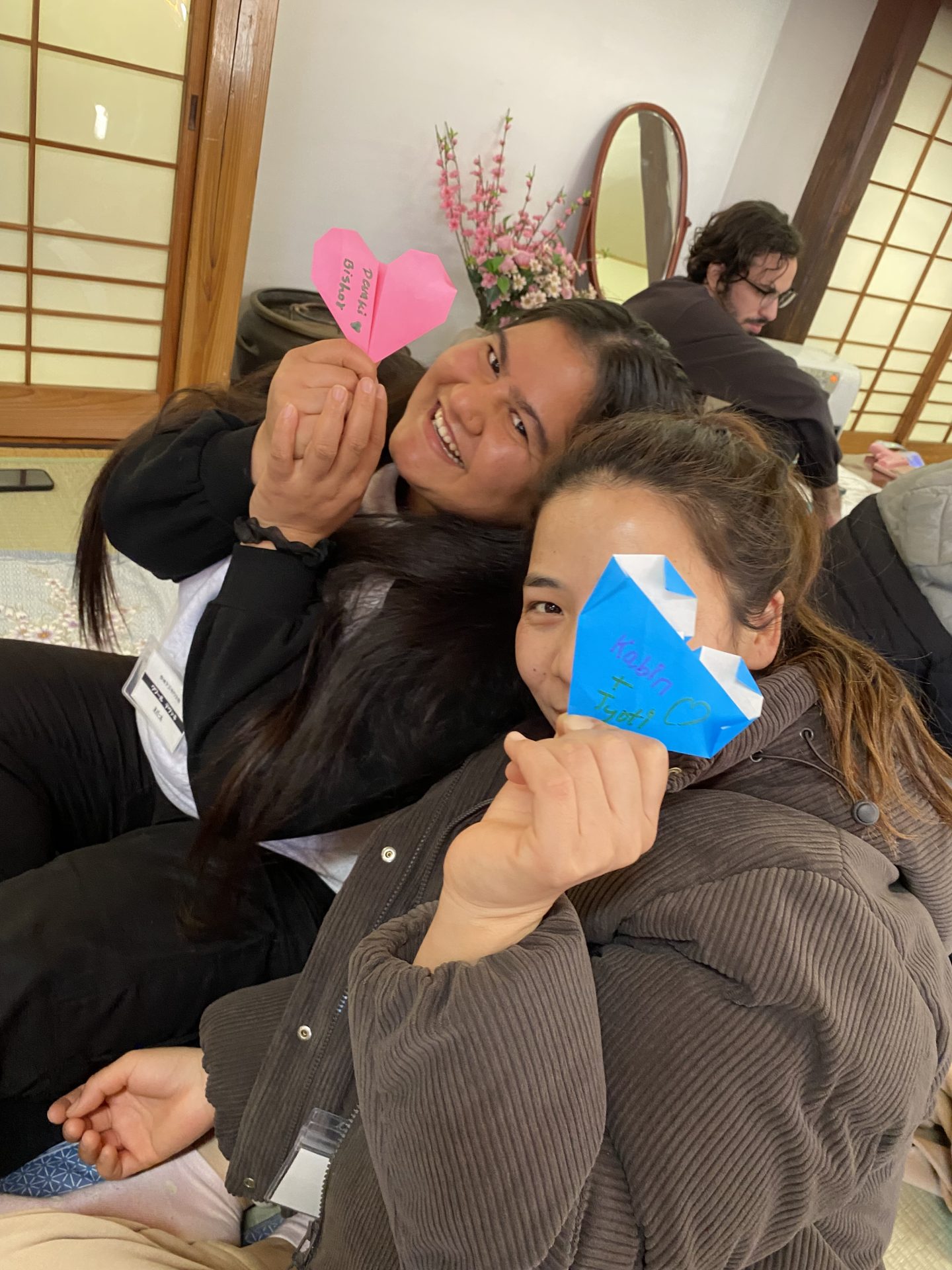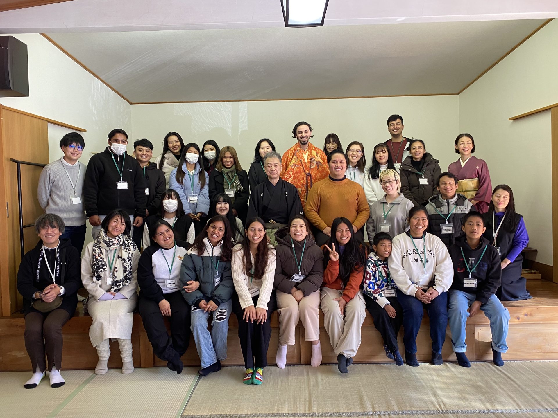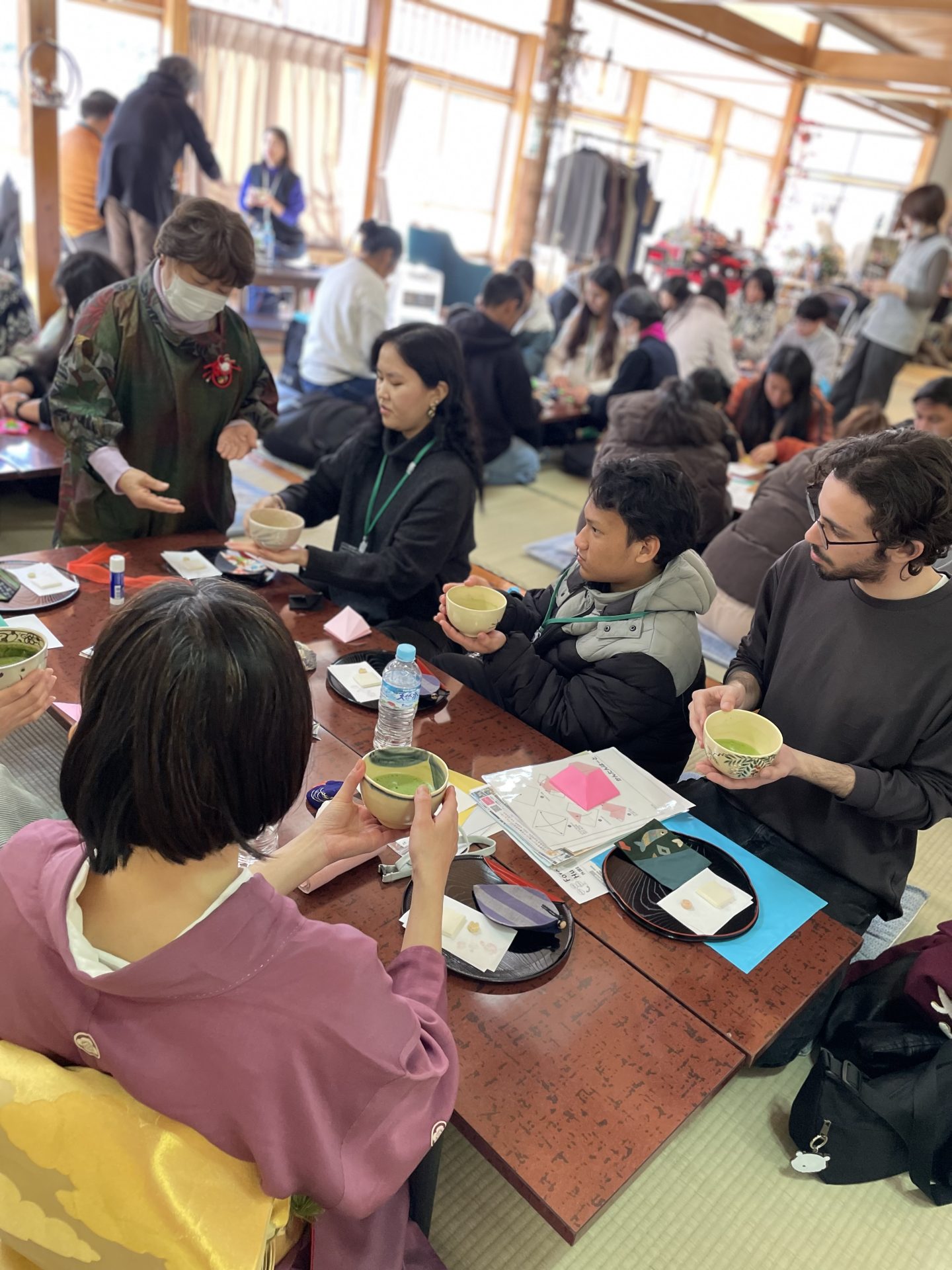 午後(ごご)は、さわのゆの永山代表(ながやまだいひょう)から抹茶(まっちゃ)の作法(さほう)を教(おそ)わりながら、抹茶(まっちゃ)をいただきました。そして、けん玉(だま)やお手玉(だま)などの日本(にほん)の遊(あそ)びを楽(たの)しみました。なかでもふくわらいは大盛(おおも)り上(あ)がり、笑顔(えがお)が溢(あふ)れました。