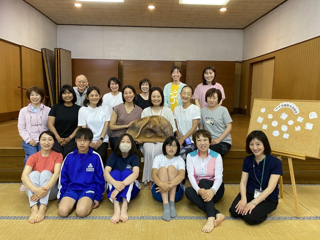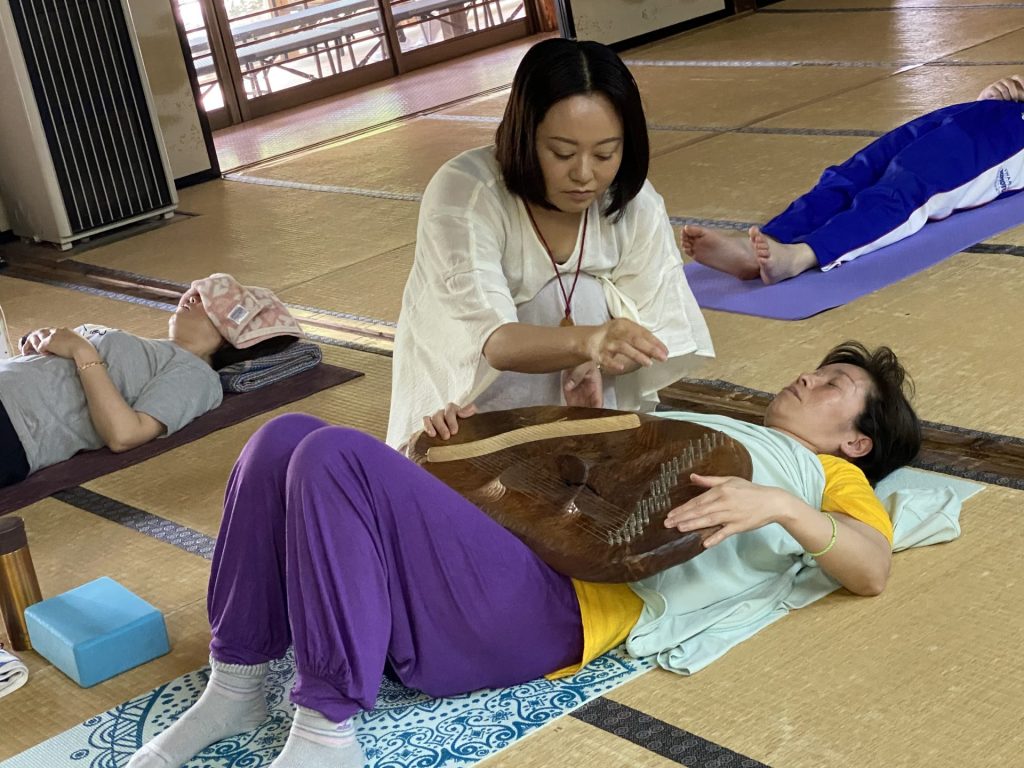 6月(がつ)7日(なのか)(土ど)、飯野八幡宮会館(いいのはちまんぐうかいかん)で「ヨガ体験(たけん)&ライアー体感(たいかん)」を開催(かいさい)し、4か国(こく)、14名(めい)が参加(さんか)しました。前半(ぜんはん)は木村明美(きむらあけみ)さんによるヨガで、身体全体(しんしんぜんたい)をゆったりとリラックスさせた後(あと)、後半(こうはん)は、遠藤愛美(えんどうあいみ)さんがドイツにルーツを持(も)つ楽器(がっき)ライアーをひとりひとりのお腹(なか)にのせて、やさしい音(おと)を奏(かな)でました。体感者(たいかんしゃ)の身体(からだ)を通(とお)って響(ひび)くその音色(ねいろ)は、華(はな)やかだったり、深(ふか)く静(しず)かに響(ひび)いたりと、それぞれ違(ちか)って聞(き)こえたのが不思議(ふしぎ)でした。母国(ぼこく)の風景(ふうけい)や自然(しぜん)をイメージしながらメロディを感(かん)じていたと話(はな)す人(ひと)もいて、イベントは参加(さんか)した皆(みな)さんを癒(いや)し、笑顔(えがお)にしてくれました。