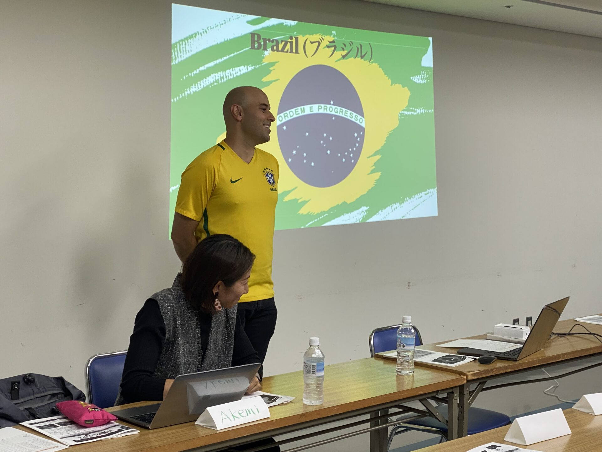 10/7、21(火(か))、ワールド・ツアーズ(ブラジル編(へん)を開催(かいさい)し、12名(めい)が参加(さんか)しました。 講師(こうし)はブラジル出身(しゅっしん)のルーカスさんが務(つと)め、歴史(れきし)、民族(みんぞく)、料理(りょうり)、スポーツ、音楽(おんがく)、ボルトガル語(ご)など、ブラジルの魅力(みりょく)を、色鮮(いろあざや)かな映像(えいぞう)とともに、英語(えいご)で紹介(しょういかい)しました。 ルーカスさんが伝(つた)えるブラジルは、サ ッカー、サンバなどを想像(そうぞう)する日本人(にほんじん)の単一(たんいつ)なイメージを超(こ)え、豊(ゆた)かな自然(しぜん)と資源(しげん)に恵(めぐ)まれた多面的(ためんてき)な魅力(みりょく)を持(も)つ国(くに)でした。また、ポルトガル語(ご)と英語(えいご)の通訳(つうやく)を兼(か)ねて、講座(こう)をお手伝(つだ)いいただいた木村(きむら)明美(あけみ)さんとの即興(そっきょう)のダンス披露(ひろう)や、参加者(さんかしゃ)のためにシェフの腕(うで)を生(い)かして作(つく)ったブラジルのキャロットケーキ「Bolo de cenoura(ボーロ・ジ・セノーラ )」のサプライズプレゼントもありました。講座(こうざ)は、ブラジルの限(かぎ)りない潜在性(せんざいせい)を存分(ぞんぶん)に伝(つた)えただけでなく、ルーカスさんのホスピタリティ溢(あふ)れる人間性(にんげんせい)に触(ふ)れる機会(きかい)となりました。