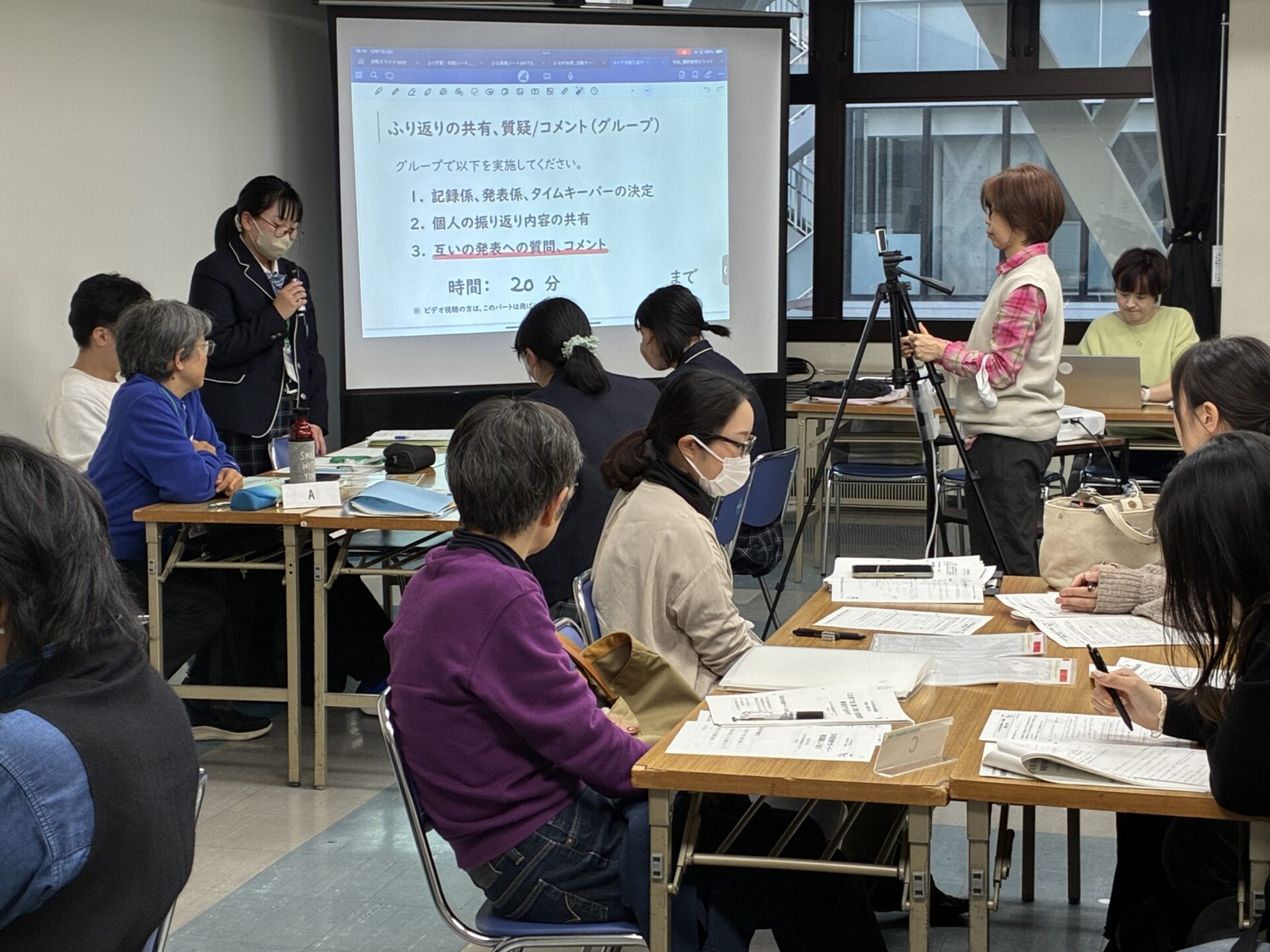 講座(こうざ)には自治体職員(じちたいしょくいん)、企業(きぎょう)、ボランティアなど、外国人(がいこくじん)に関(かか)わりのある65名(めい)(録画配信(ろくがはいしん)希望者(きぼうしゃ)含(ふく)む)の申(もう)し込(こ)みがありました。会場(かいじょう)では34名(めい)(外国人(がいこくじん)2名(めい))の受講者(じゅこうしゃ)が、外国人(がいこくじん)の心(こころ)の声(こえ)を日本語(にほんご)にした動画(どうが)を見(み)たり、グループに分(わ)かれて、「伝(つた)えたい本質(ほんしつ)をやさしい日本語(にほんご)で相手(あいて)にわかりやすく伝(つた)える練習(れんしゅう)も行いました。