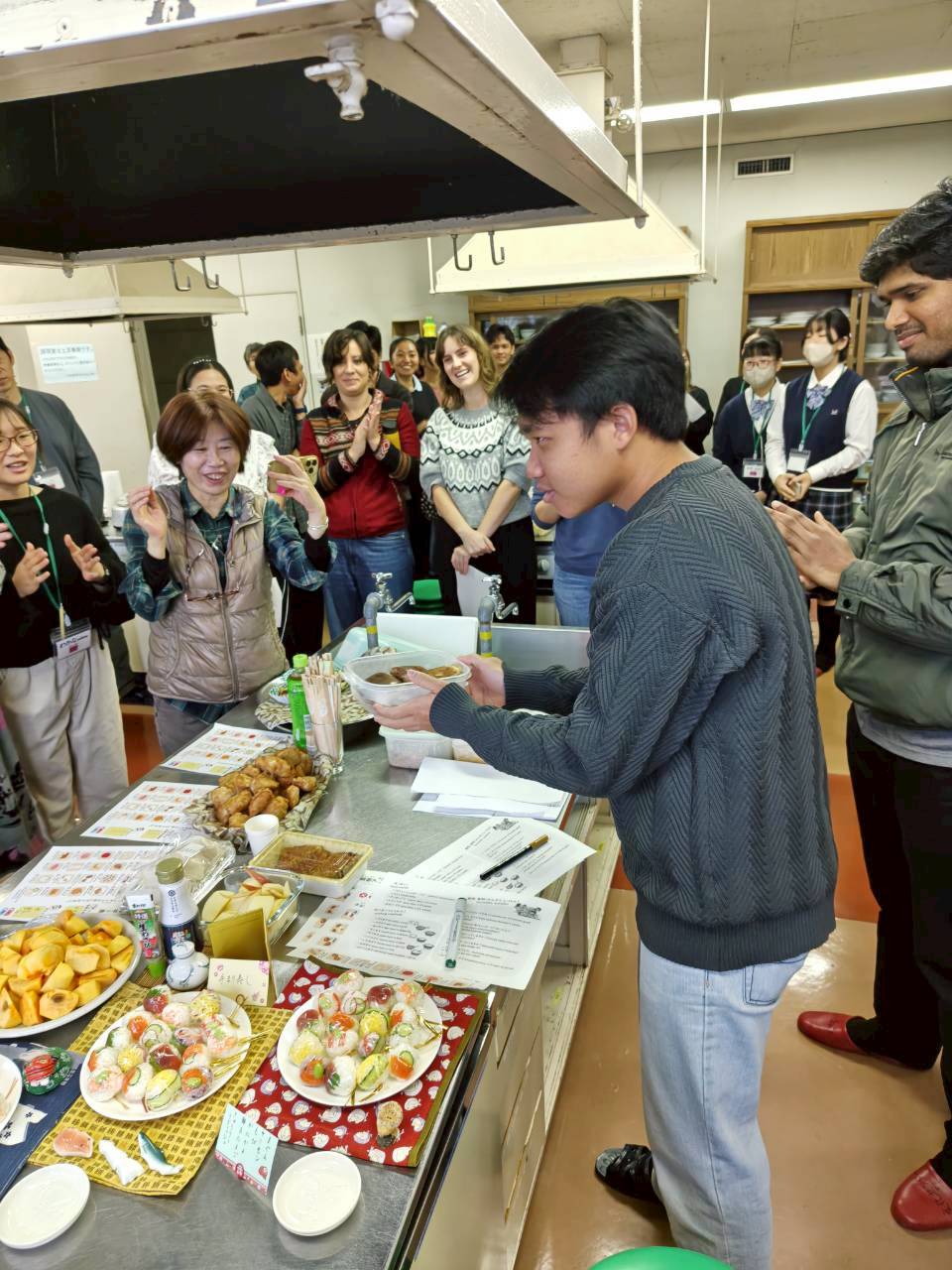 11月(がつ)9日(ここのか)(日(にち))、日本語(にほんご)教室(きょうしつ)の入門(にゅうもん)と交流(こうりゅう)のクラス合同(ごうどう)でポットラックパーティを開催(かいさい)し、36名(めい)が参加(さんか)しました。皆(みな)、手料理(てりょうり)やお勧(すす)めのお菓子(かし)などを持(も)ち寄(よ)り、テーブルの上(うえ)には、わくわくするような様々(さまざま)な料理(りょうり)やお菓子(かし)が並(なら)びました。参加者(さんかしゃ)は、次々(つぎつぎ)とお料理(りょうり)を頬(ほお)ばりながら、作(つく)り方(かた)や味(あじ)の感想(かんそう)などを日本語(にほんご)で話(はな)しあったり、写真(しゃしん)を撮(と)ったりと、お腹(なか)も気持(きも)ちも満(み)ち足(た)りた時間(じかん)を過(す)ごしました。