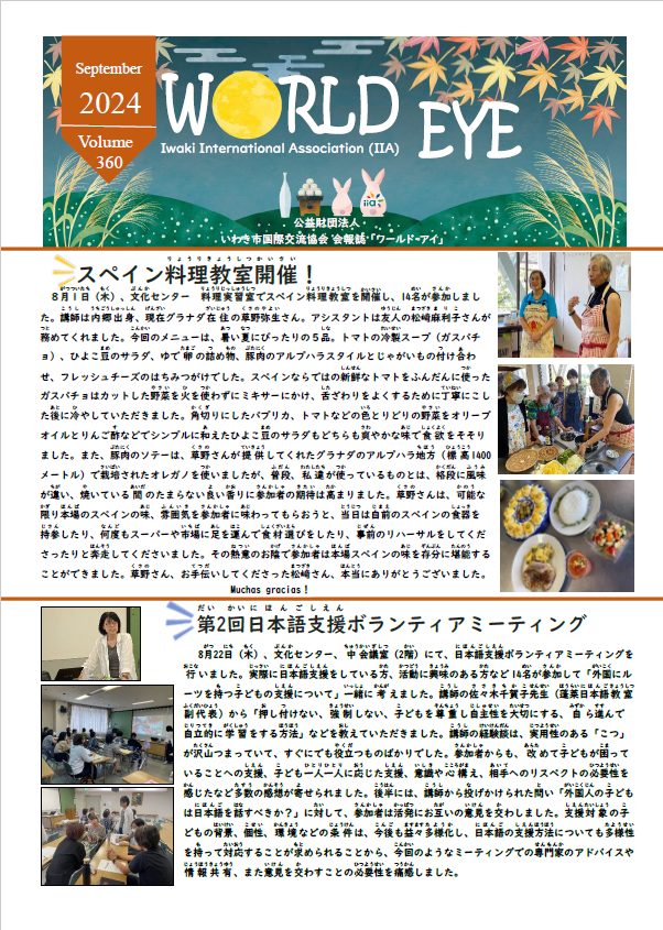 IIA 已举办 愉快地学习防灾 快来学习防灾知识和有用的信息吧! 快来看看!体验一下! 用纸牌游戏和制作防灾用品,来学习防灾知识。 还可以品尝灾害期间吃的非常食品和体验如何系绳子展示区。... 11/10/2024